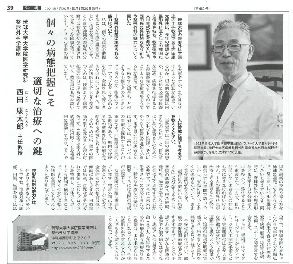 2021年3月20日九州医事新報に西田康太郎教授の記事が掲載されました