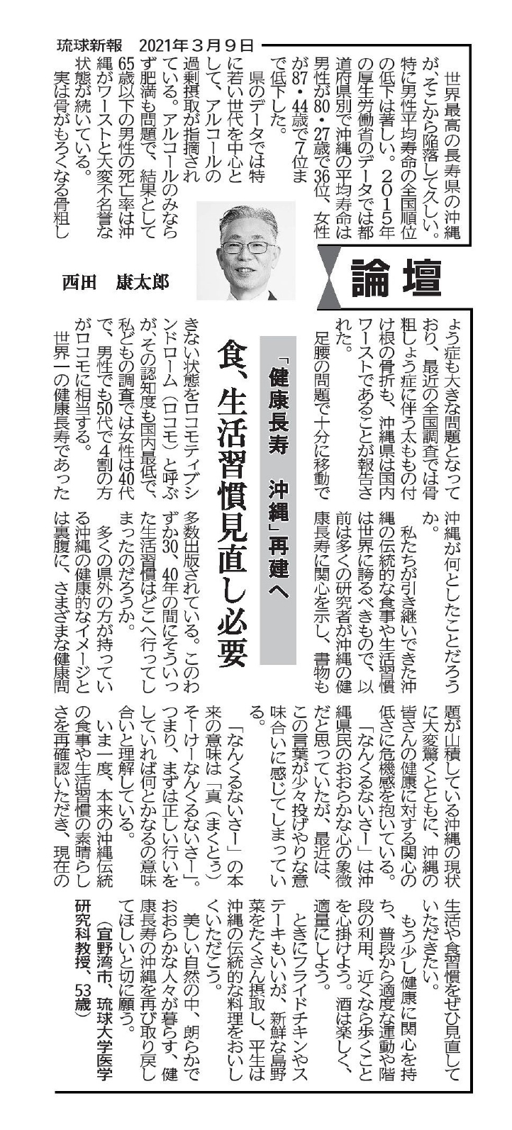 2021年3月9日琉球新報に西田康太郎教授の論壇が掲載されました